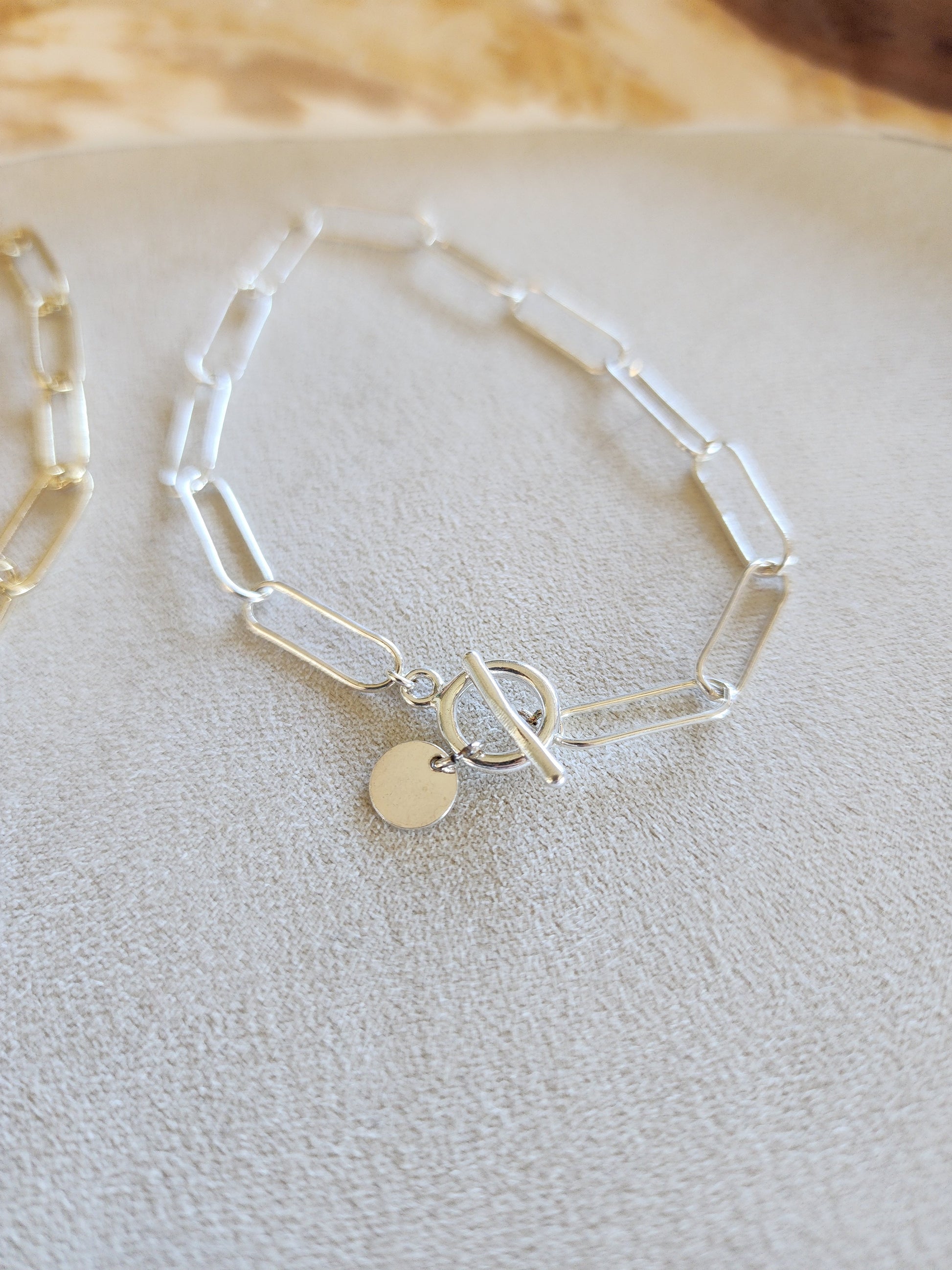 I love this chunky bracelet paired with my dainty bracelets. A thick, sturdy, paperclip chain with our mini 925 Sterling Silver Toggle Clasp and 925 sterling mini accent disc charm.