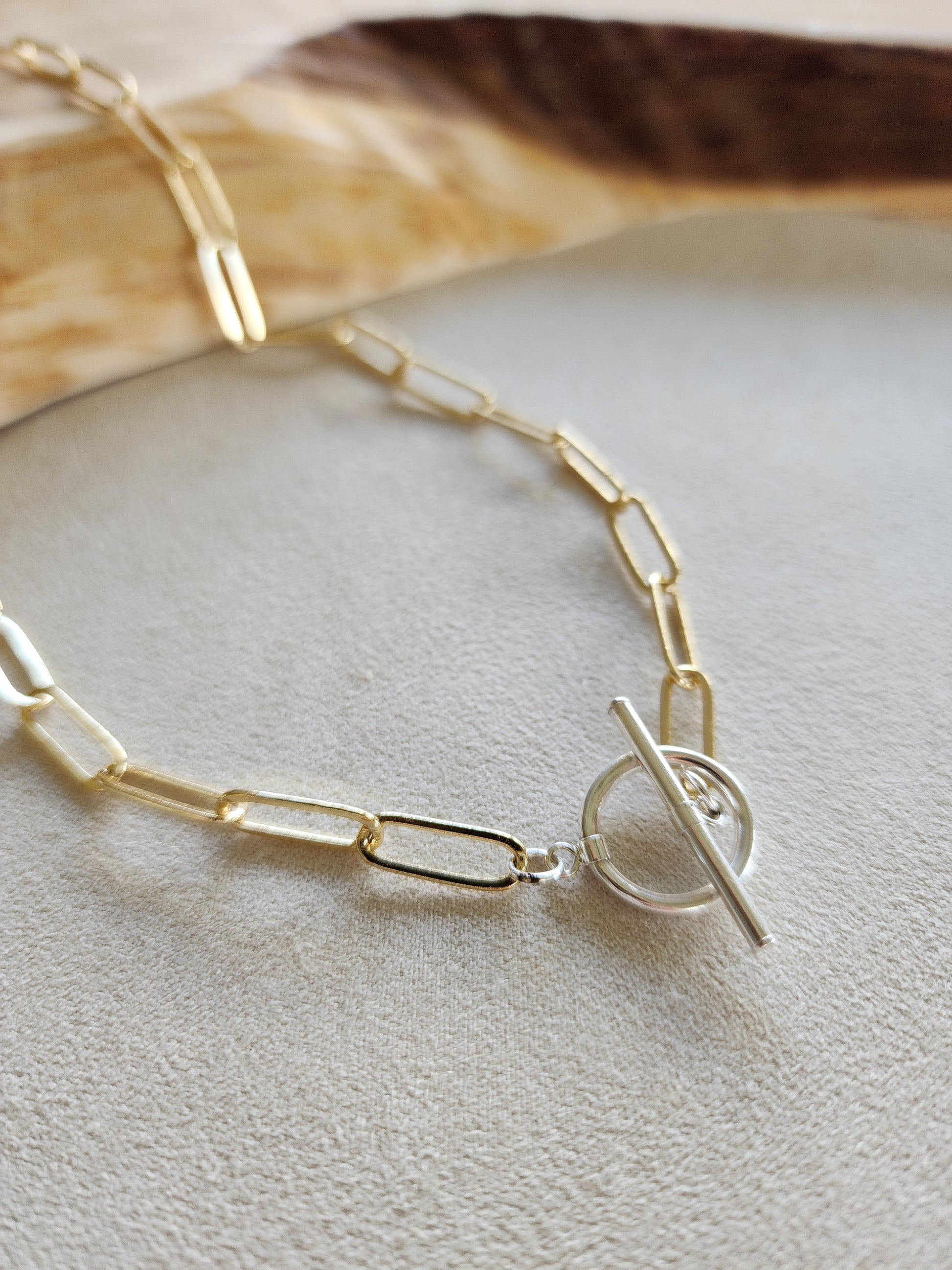 Make our Mixed Metal Chunky Necklace front and center. 14k Gold-filled Chunky Paperclip chain and a 925 Sterling Silver toggle- clasp. Worn with the toggle-clasp in front or slightly off-centered.