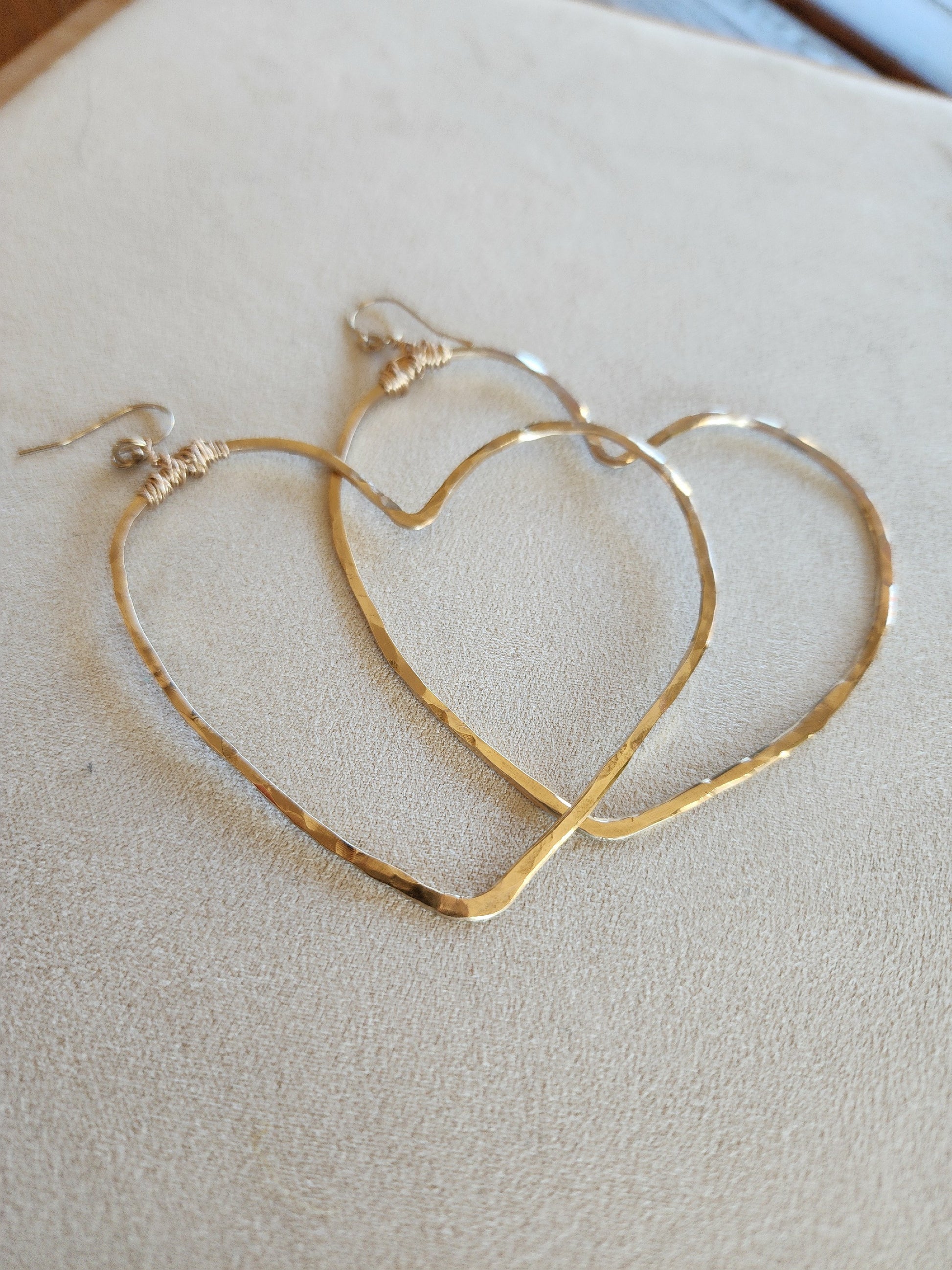 These 14k Gold-Filled Large Heart Earrings are hand hammered, shaped and polished, making each pair unique. The detail of the hammering reflects light perfectly. Measuring approximately 2.5 inches and perfect for sensitive ears. Surprisingly light-weight as well.