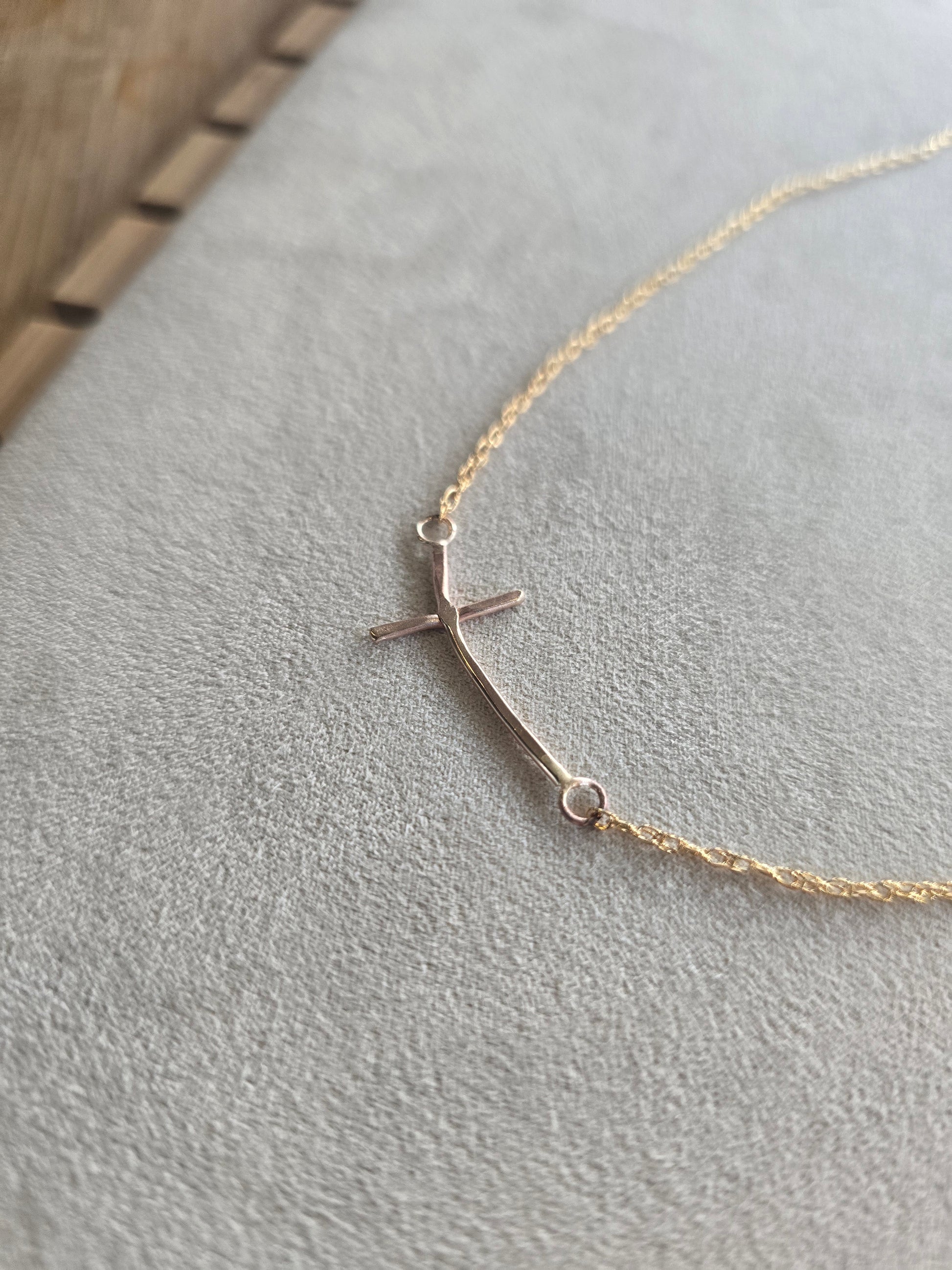 Hand-Hammered, soldered and shaped making each cross slightly unique. Available in all 4K Gold filled or All Sterling Silver, on our dainty but sturdy rope chain. Cross measures approximately 1 inch and connects for effortless, everyday look no matter your activity,
