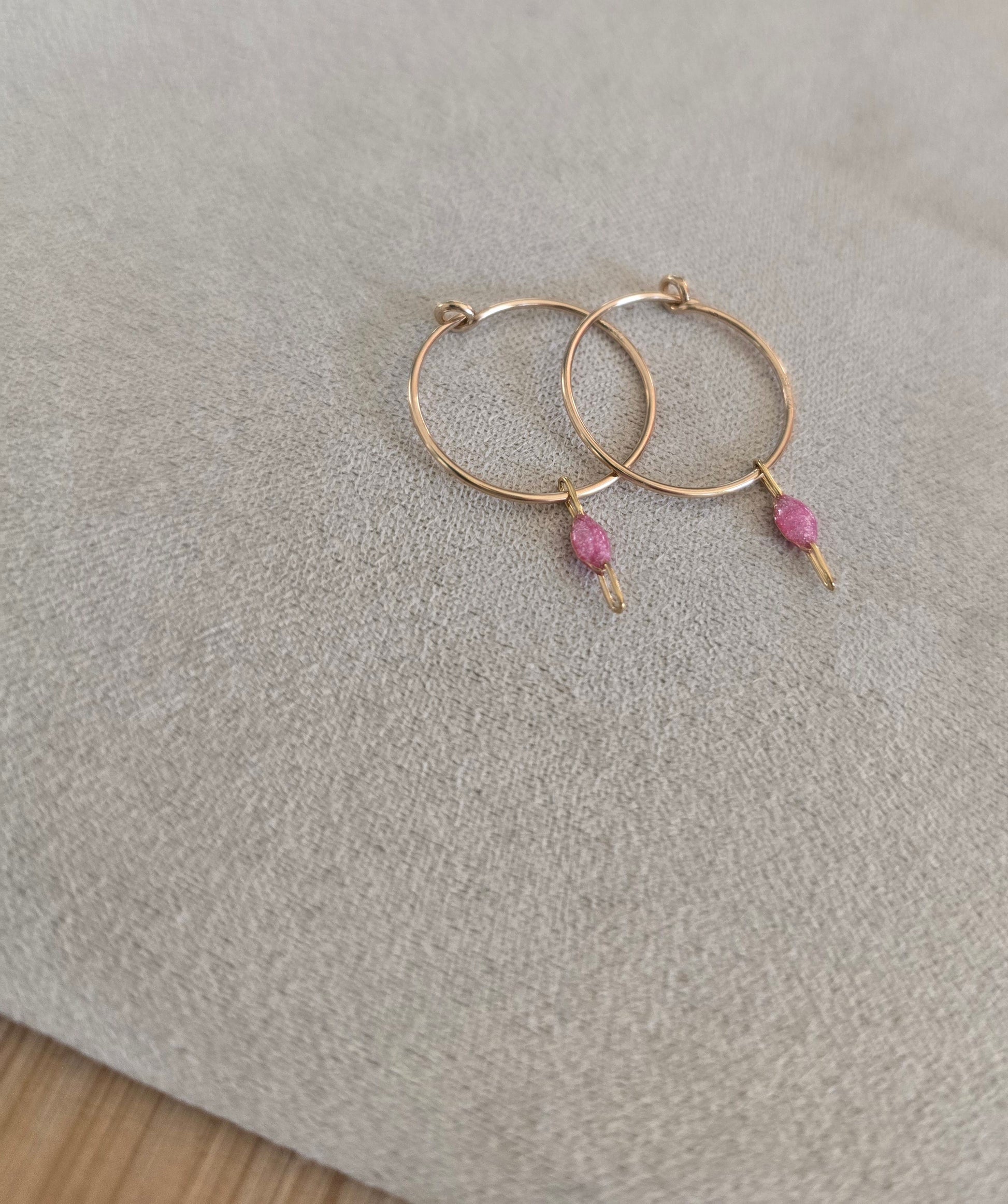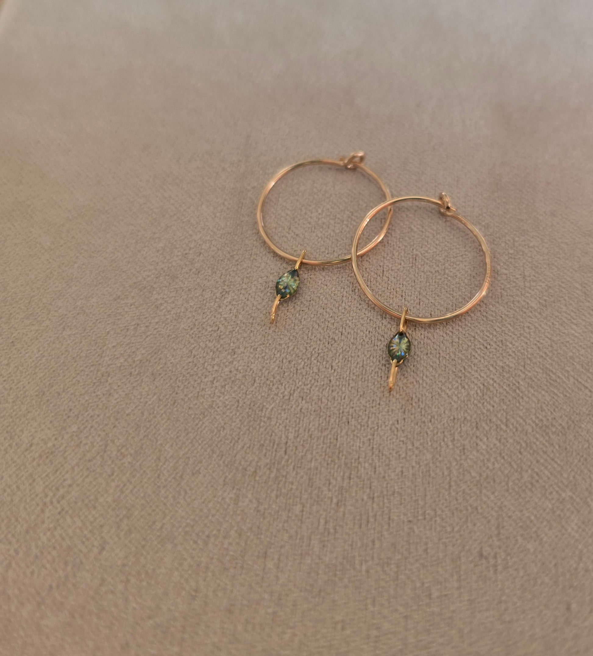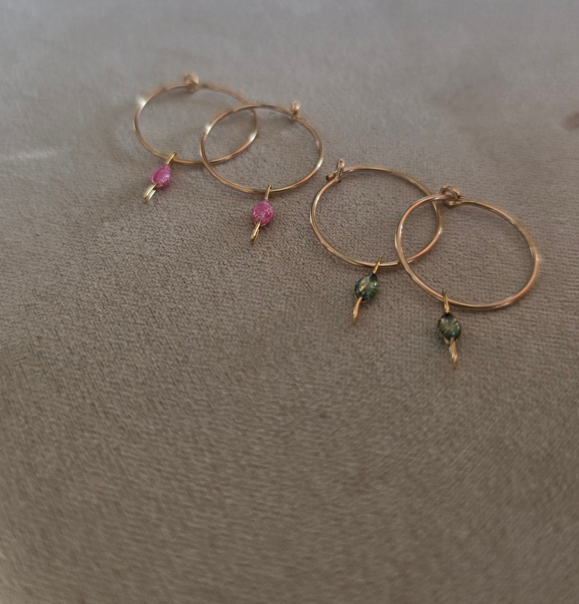 A classic medium size hoop featuring our Aqua or Pink Opal Stones delicately dangling. Ultra light-weight you won't take them off....and you don't need too! 14k Gold fill for sensitive ears. Hoops measure 15mm. The glimmer in these gems is absolutely beautiful