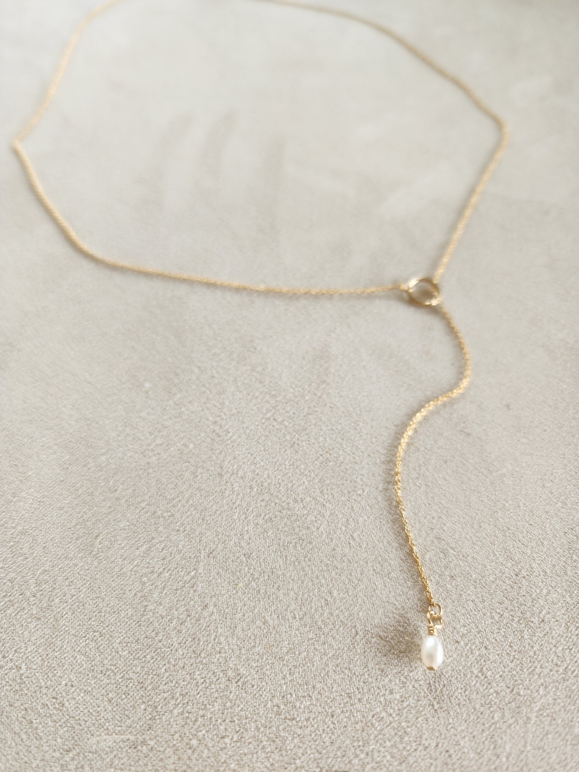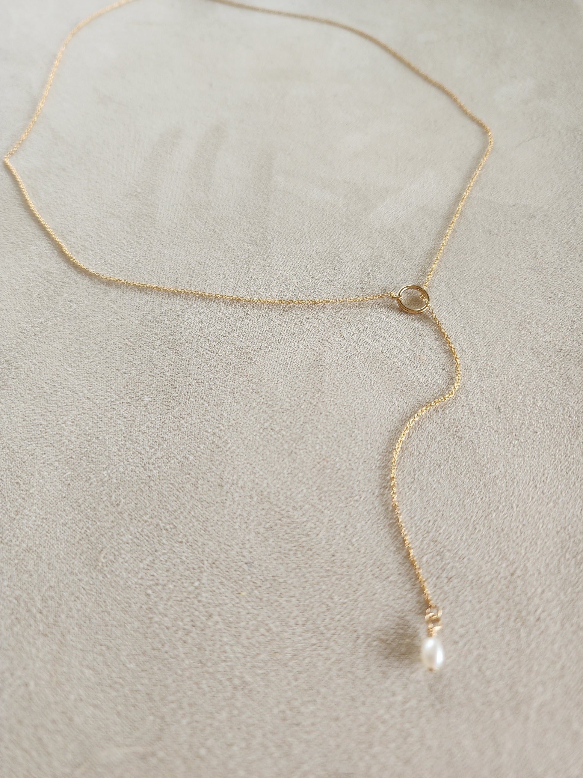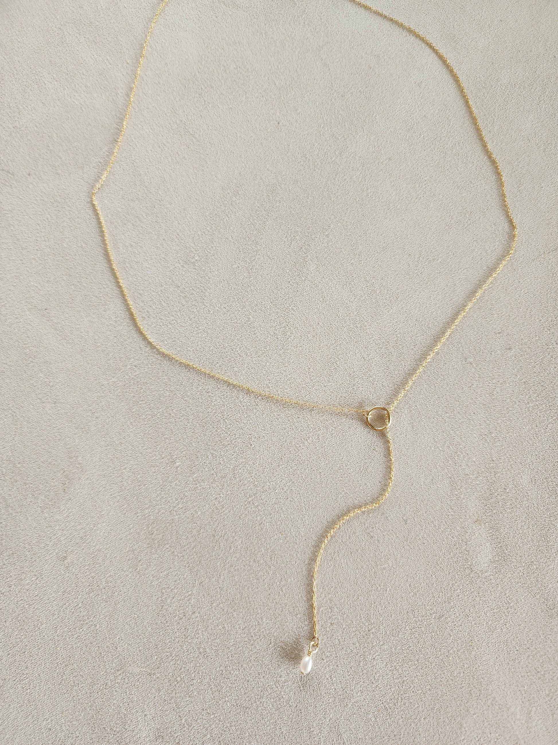 A simple classic mini freshwater Pearl on our Lariat style necklace. 14k gold-fill mini cable chain threaded through a small circle pendant.