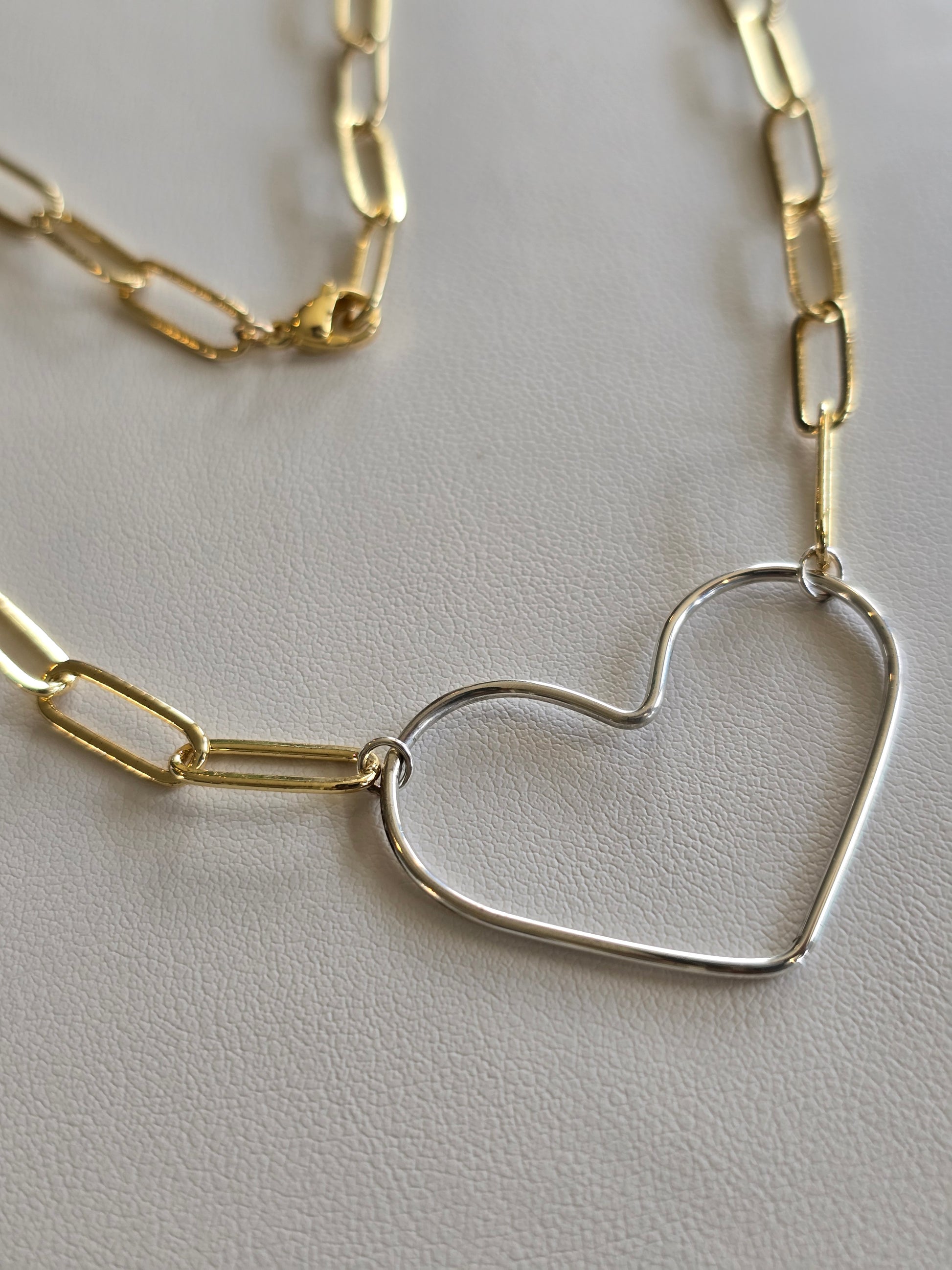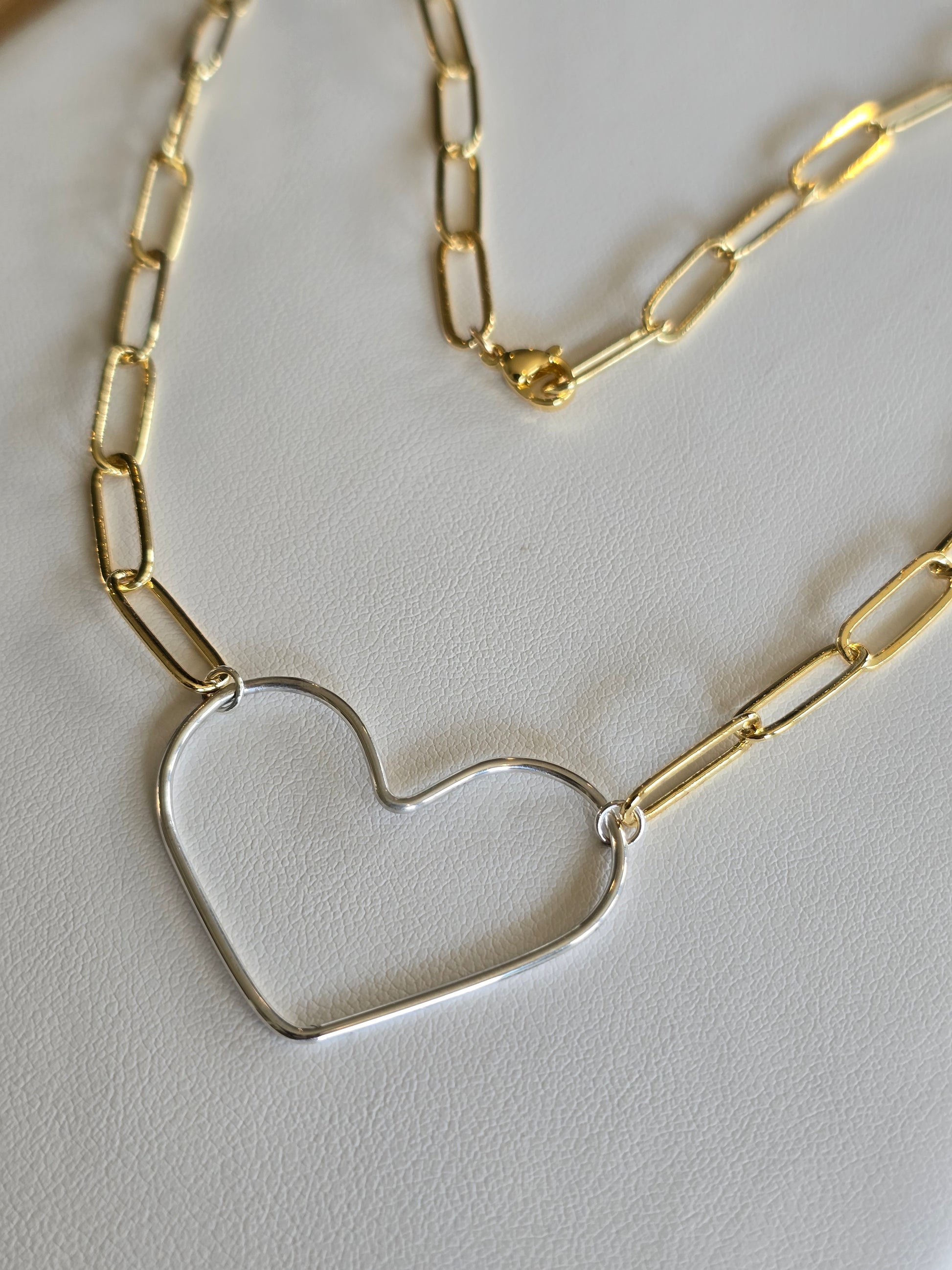 Make a statement! Hand-Shaped and Forged Sterling Silver Heart on our Gold-filled Chunky paperclip chain with a lobster clasp.