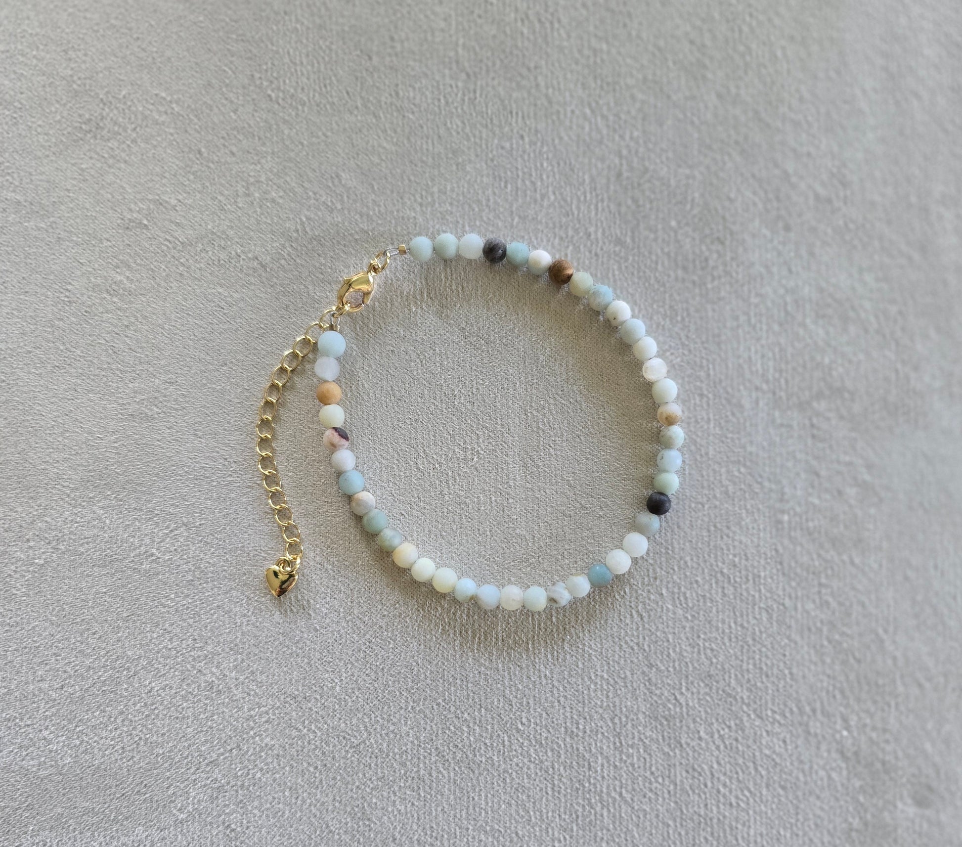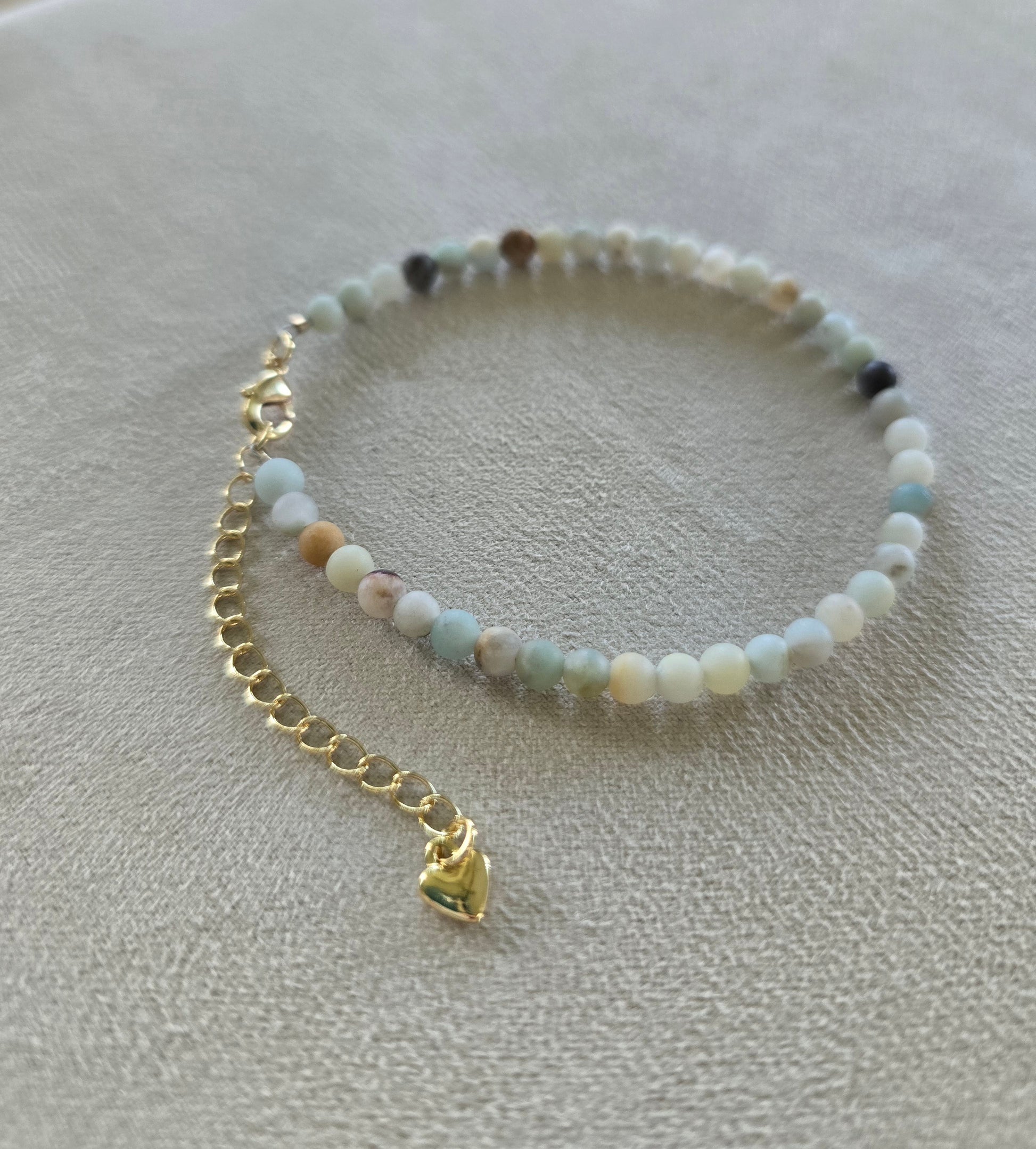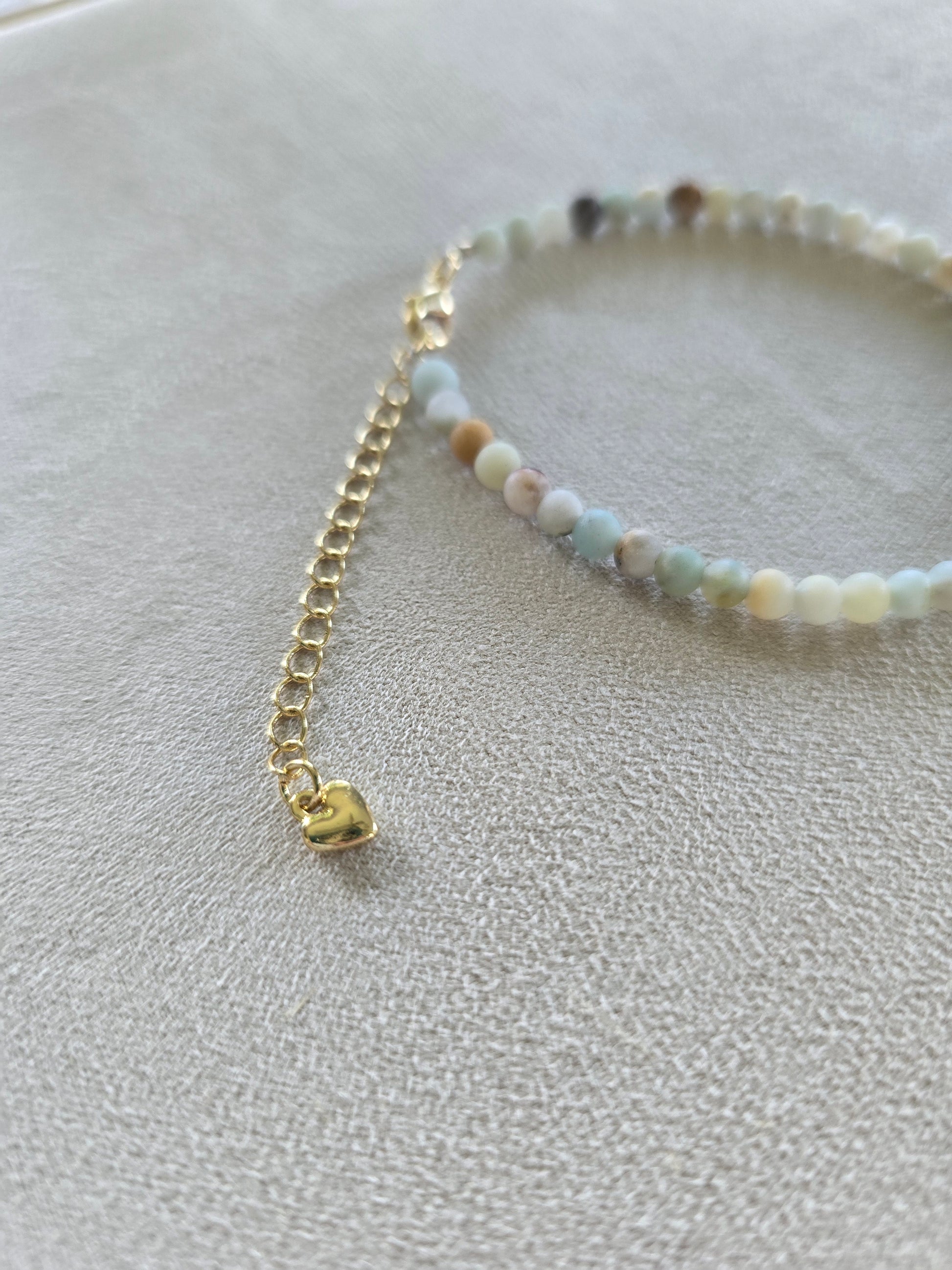 Sand and Sea melt together in Natural Amazonite stones. Adjustable 14k Gold-fill 2 inch extender for a custom fit. Adorned with a heart detail and lobster clasp. Stones vary in color making each bracelet unique!