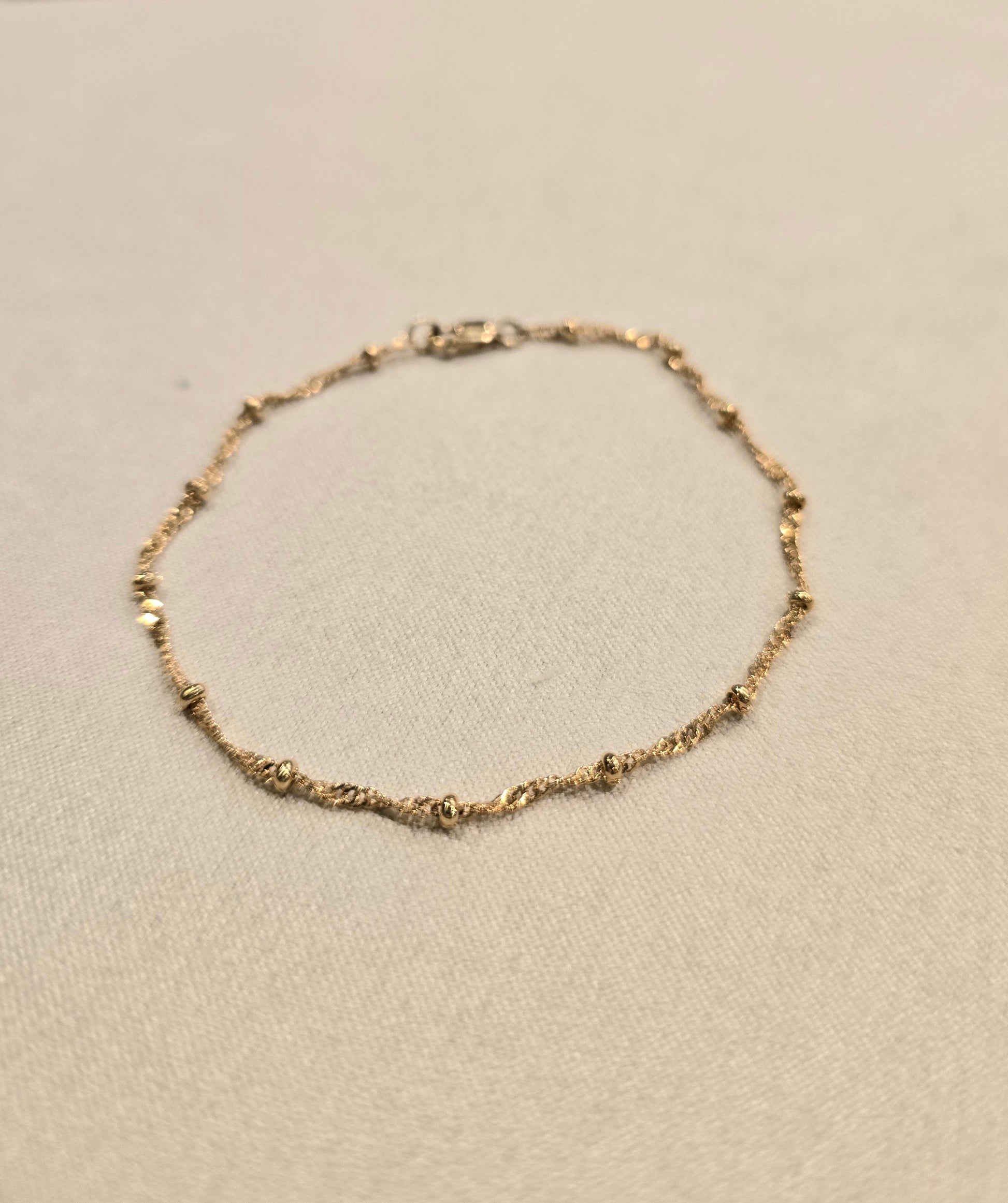 This bracelet is a dream with it's twisting weave and satellite ball details. Made of 14k Gold-fill, dainty and a sturdy lobster clasp