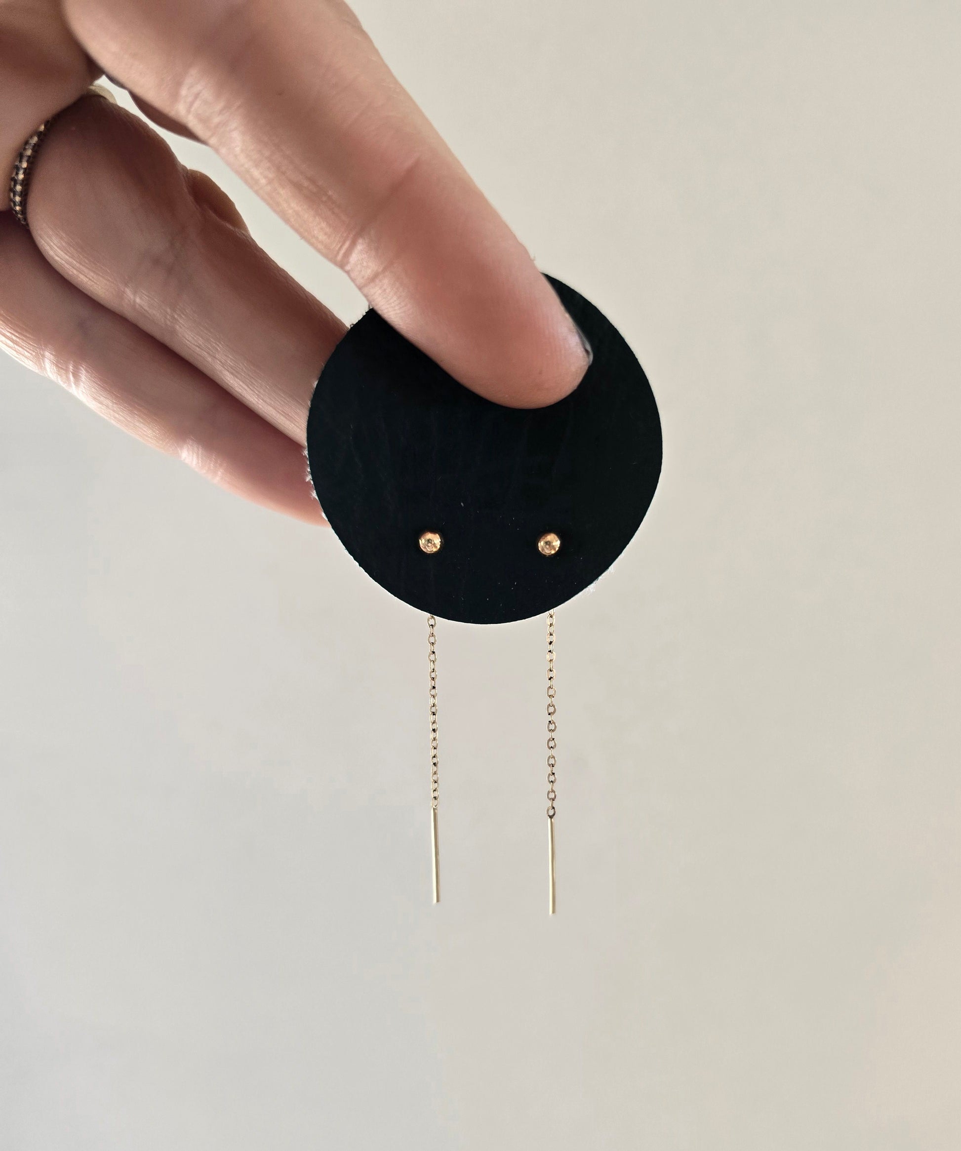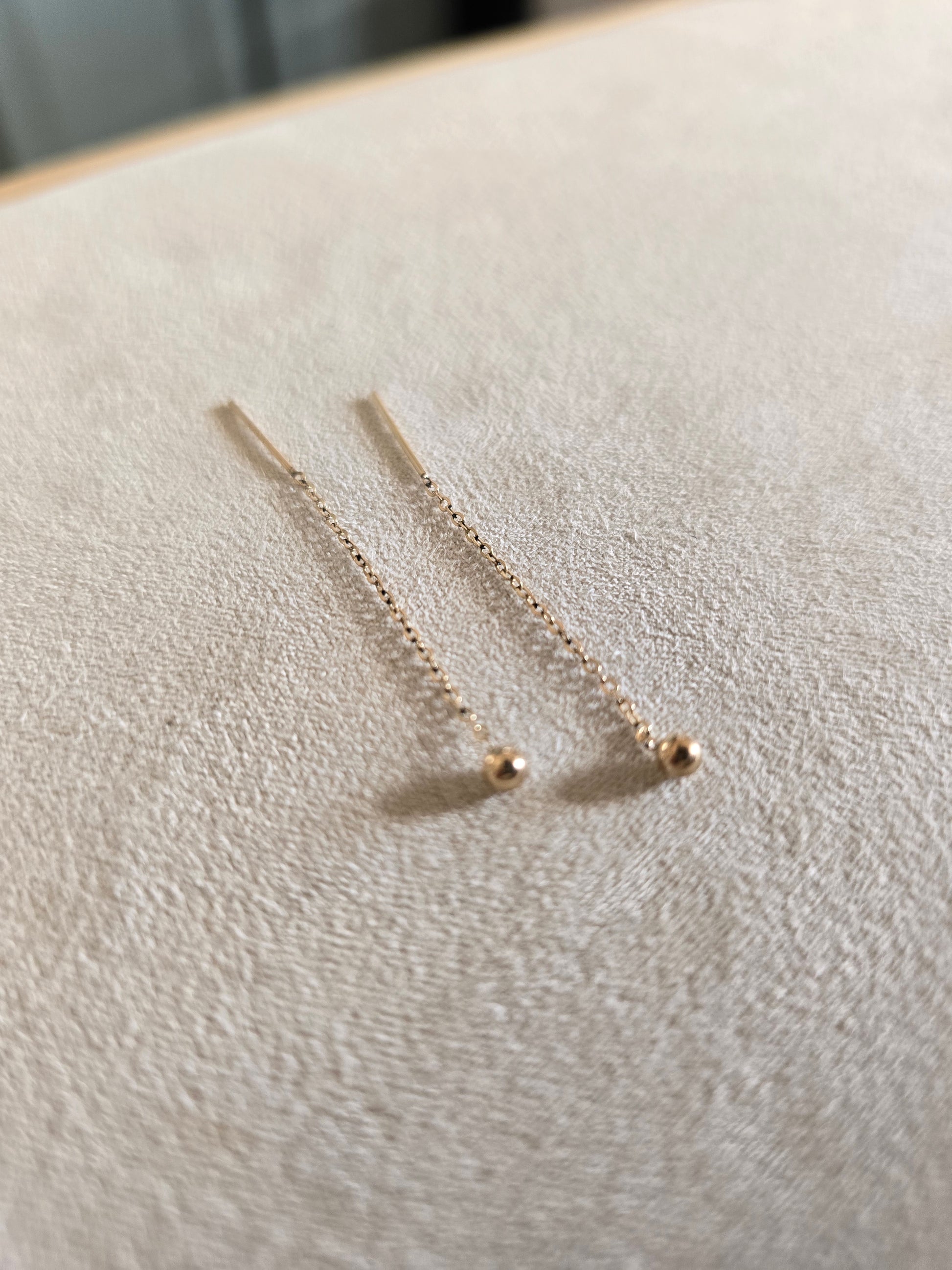 An updated version of a classic stud earring. Thread the earring through your front lobe! The gold ball will sit on your lobe like a classic stud with a small dangle in the back. Made of 14k Gold-fill, great for sensitive ears. Earrings Measure approximately 2 inch and super light weight you can even sleep with them in!