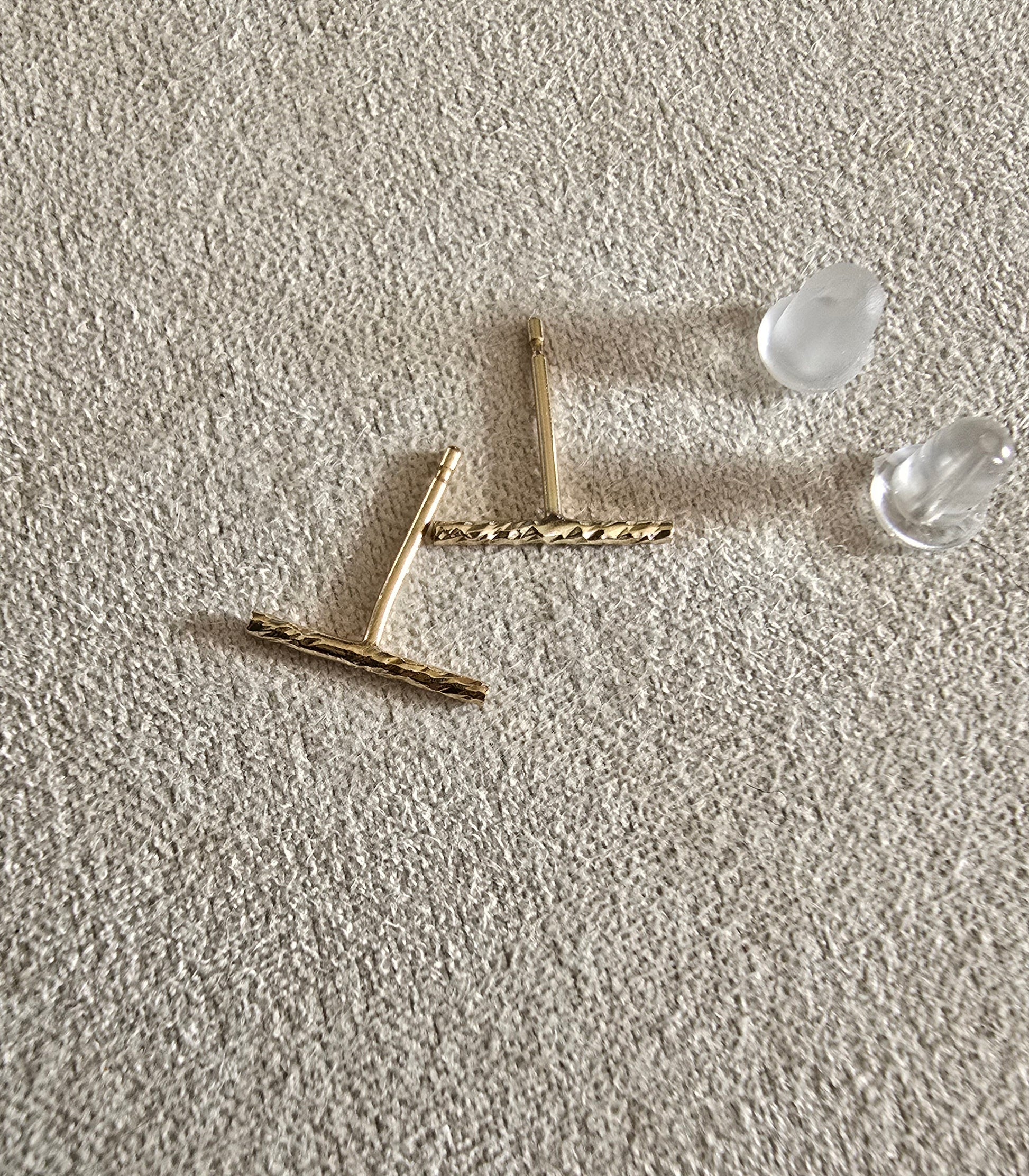 Dainty and different with a textured shimmer. Perfect for all day, everyday wear. Lightweight, comfortable and 14k Gold-Fill for my sensitive ear girls. Looks great in any lobe piercing. Bar measures approximately .5 inch