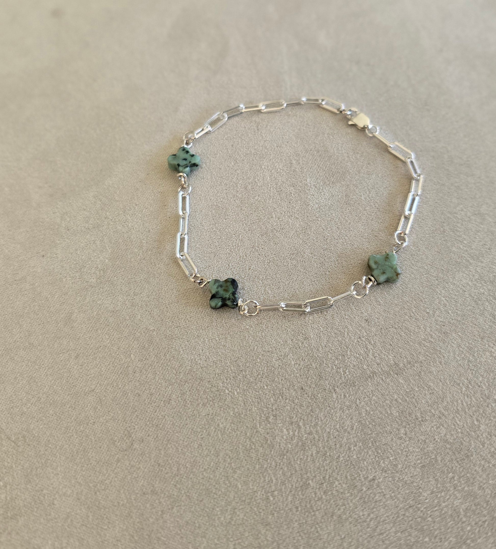 The prettiest pairing of uniquely speckled Turquoise Colored Clovers on a sturdy 925 Sterling Silver paperclip Chain. Quality, 925 Sterling Silver chain.